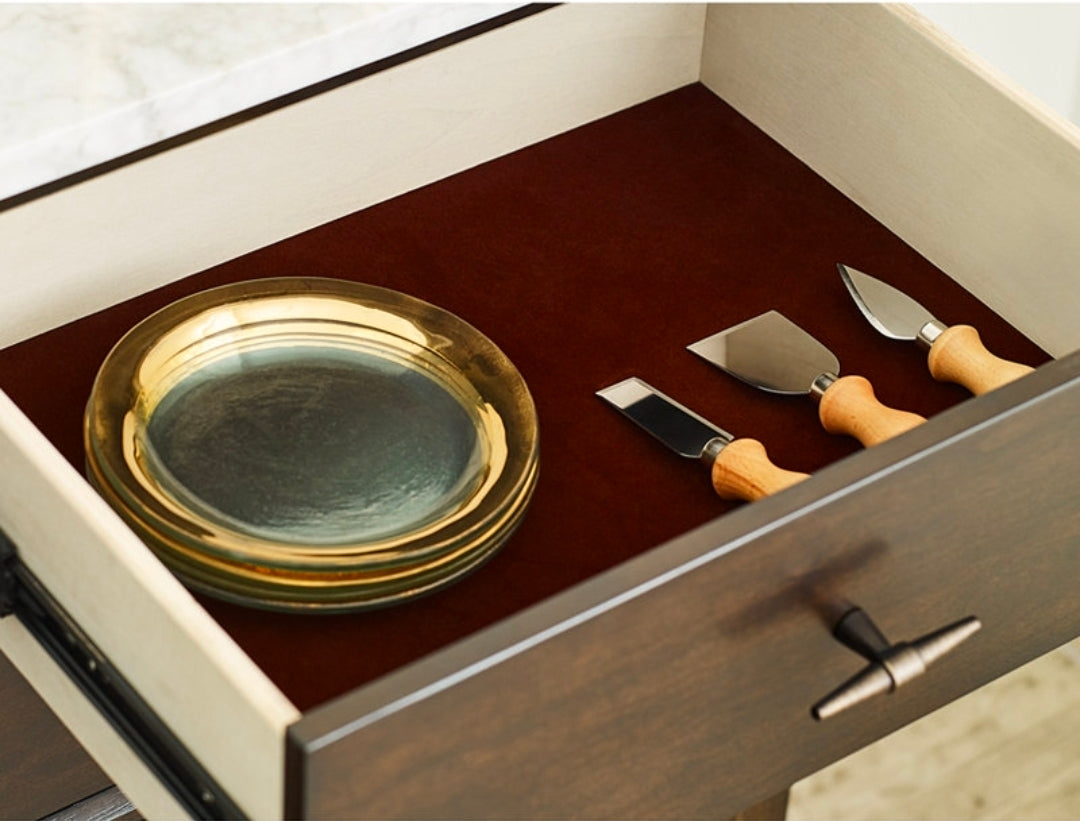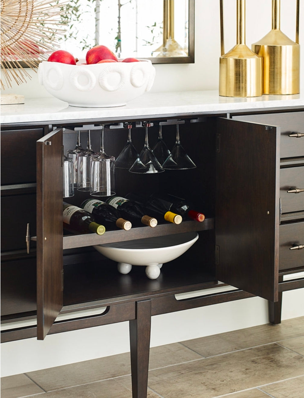 The Addelyn Sideboard embodies clean lines and refined simplicity. Featuring a rich French Roast finish paired with a burnished bronze accent and a stunning Carrara Marble top, this beautifully crafted piece adds both elegance and functionality to your dining space. It offers ample storage, enhancing the overall sophisticated aesthetic.