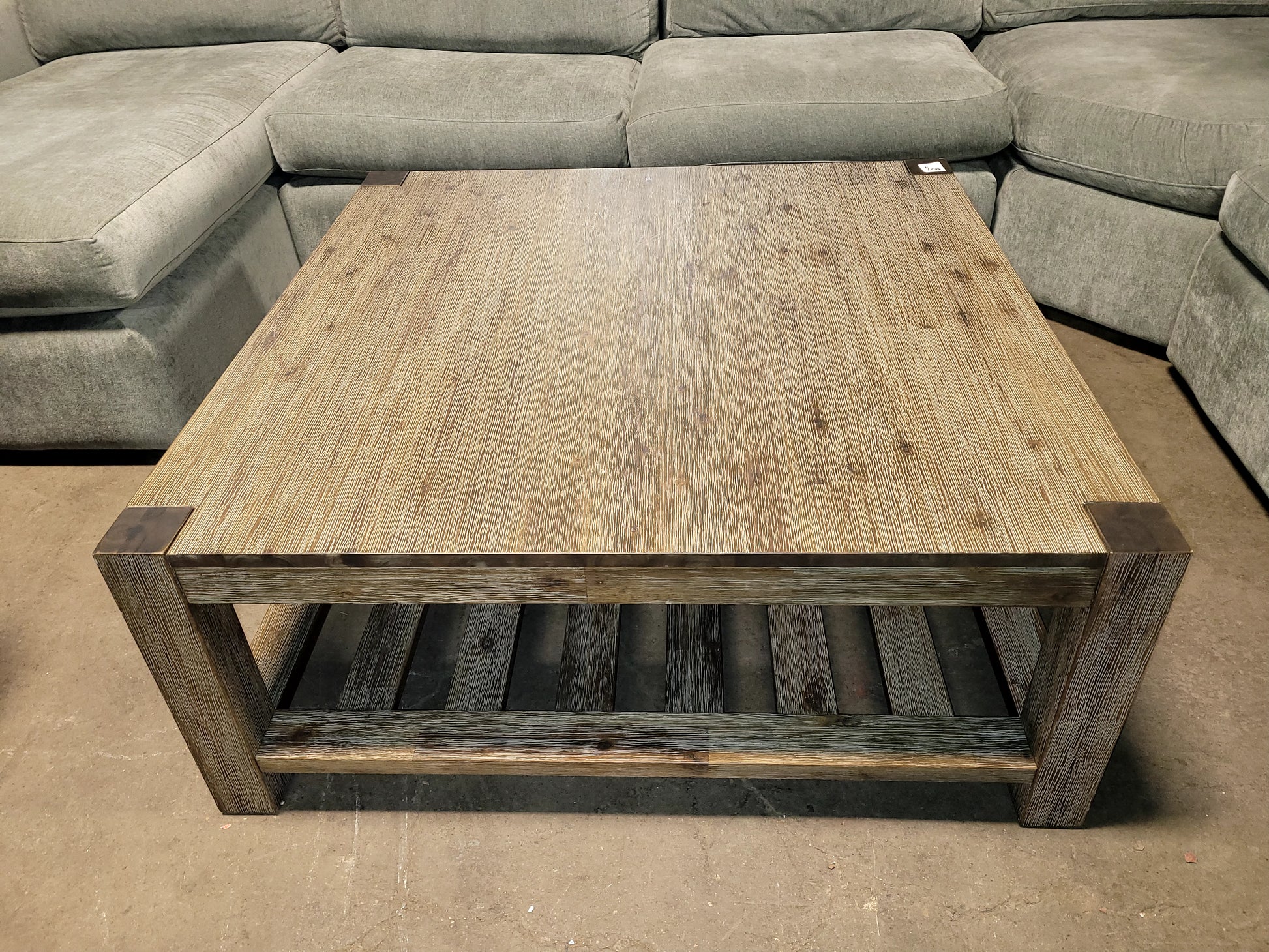 Handsome traditional styling. The clean lines of this rustic-inspired coffee table have a distressed taupe wire brushed distressing with grey undertones offering an aged look that is complemented by notched table corners and thick substantial legs that provide a striking visual statement.