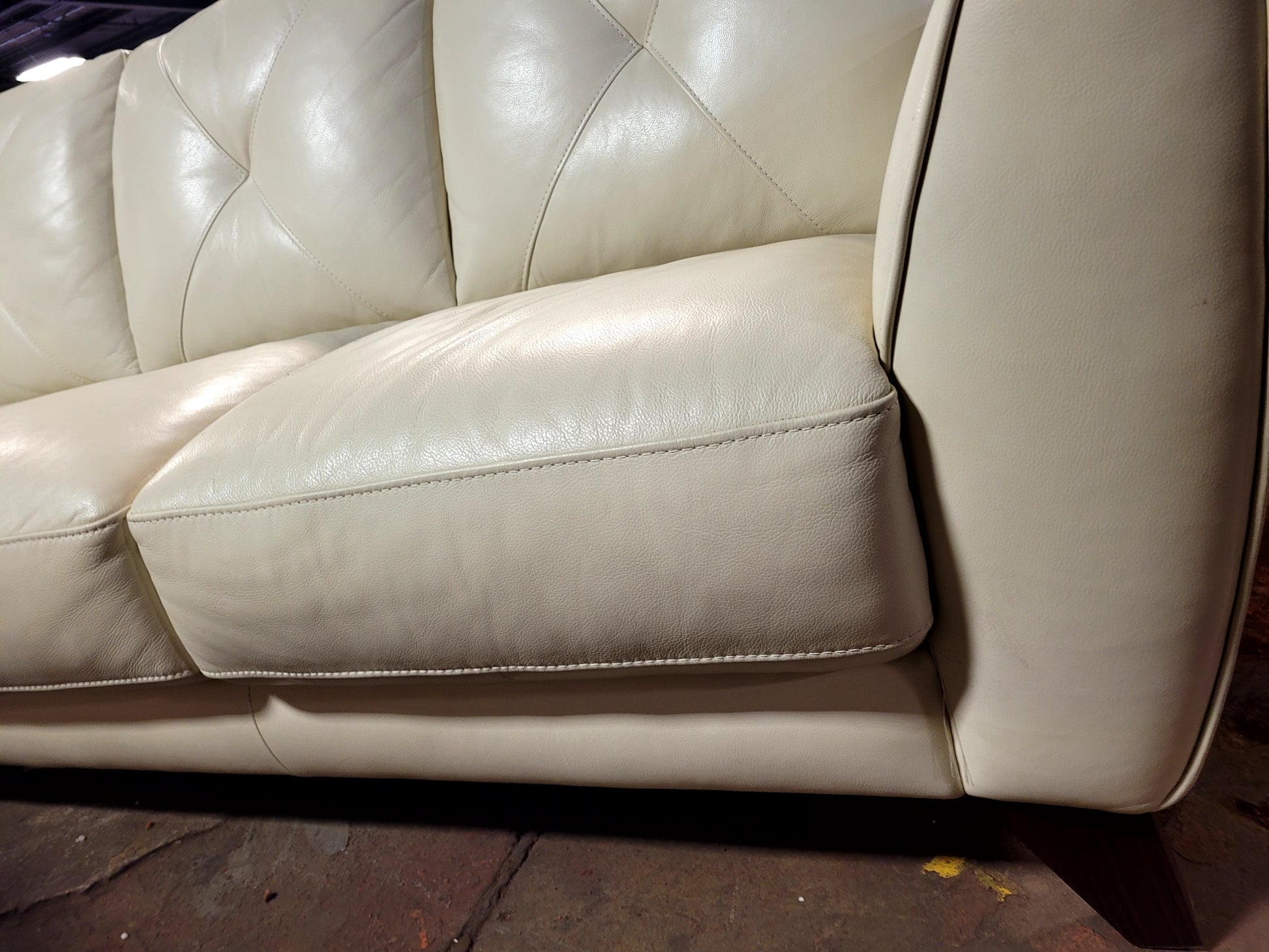 Angular arms and legs along with diamond tufting across the back cushions lend this handsome sofa its mid-century modern vibe. Contrast luggage stitching defines its lines while smooth leather over supportive cushions offer a luxuriously soft hand.
