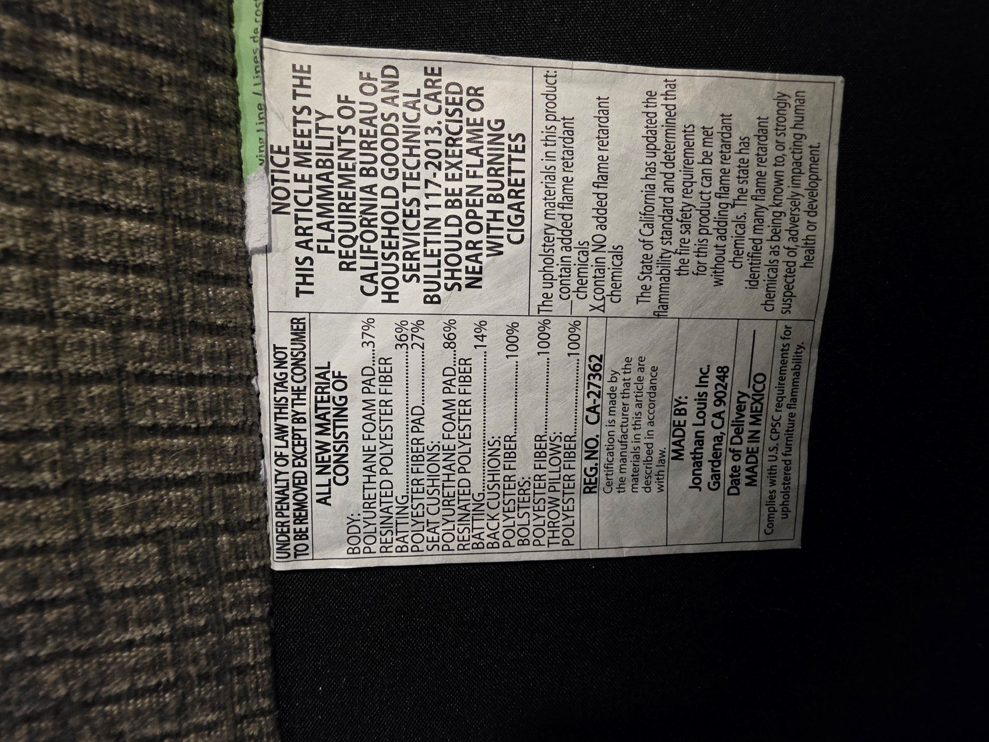 • Hardwood, engineered, pine frame; plastic legs; polyester upholstery; 1.8HR foam with 1" polyester wrap; feather, down toss pillow fill