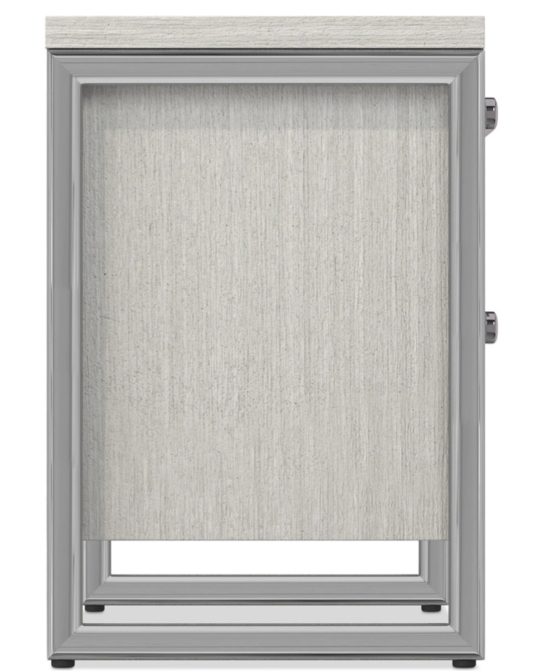The Stratum nightstand offers a bit of glamour with the gleam of polished metal from open end frames and sleek hardware. A beautiful wood grain pattern shines through in the Mist finish. Two soft-close doors provide storage while function comes from a two-port USB charging unit on the back.