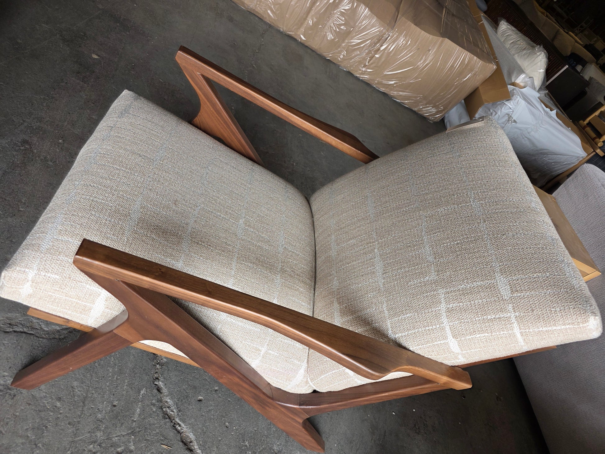 The handsome Swaxon Chair is a fusion of modern geometric style and classic Danish design, making it a unique and artistic piece for any space. The exposed walnut wood framing adds a touch of mid-century inspired elegance, while the attached back, tight upholstery and low profile seams provide comfort and a sleek look.