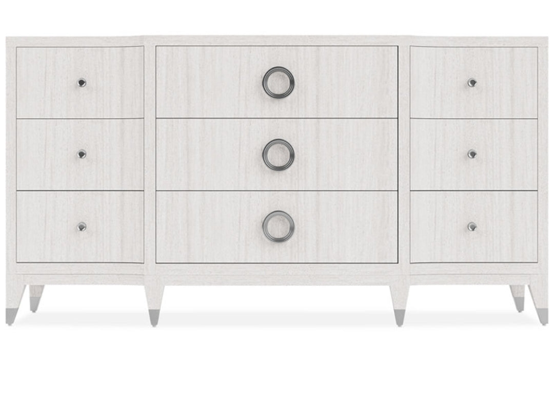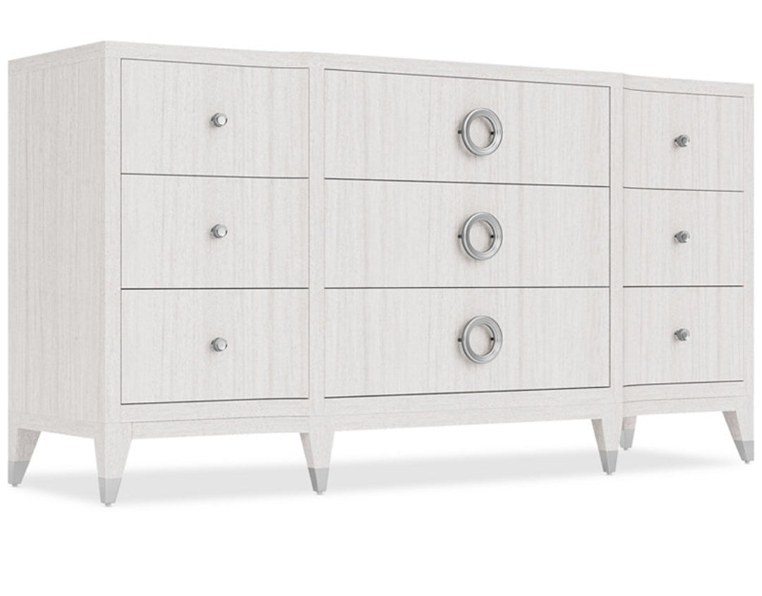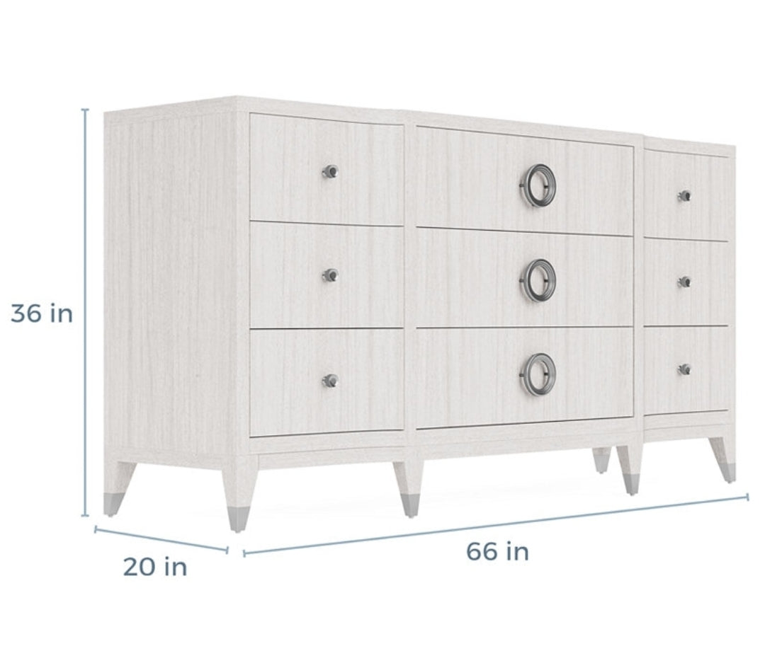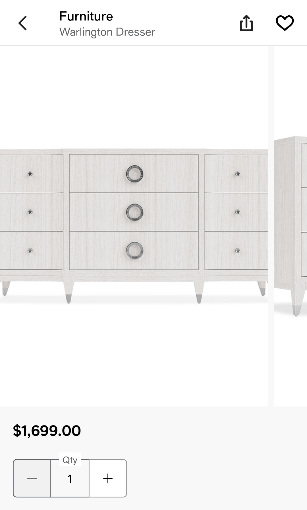 The Warlington Dresser is the perfect piece to elevate your home, leaving a lasting impression. The scalloped accents and platinum hardware with a shimmering finish, infuse a sense of luxury and refined elegance.